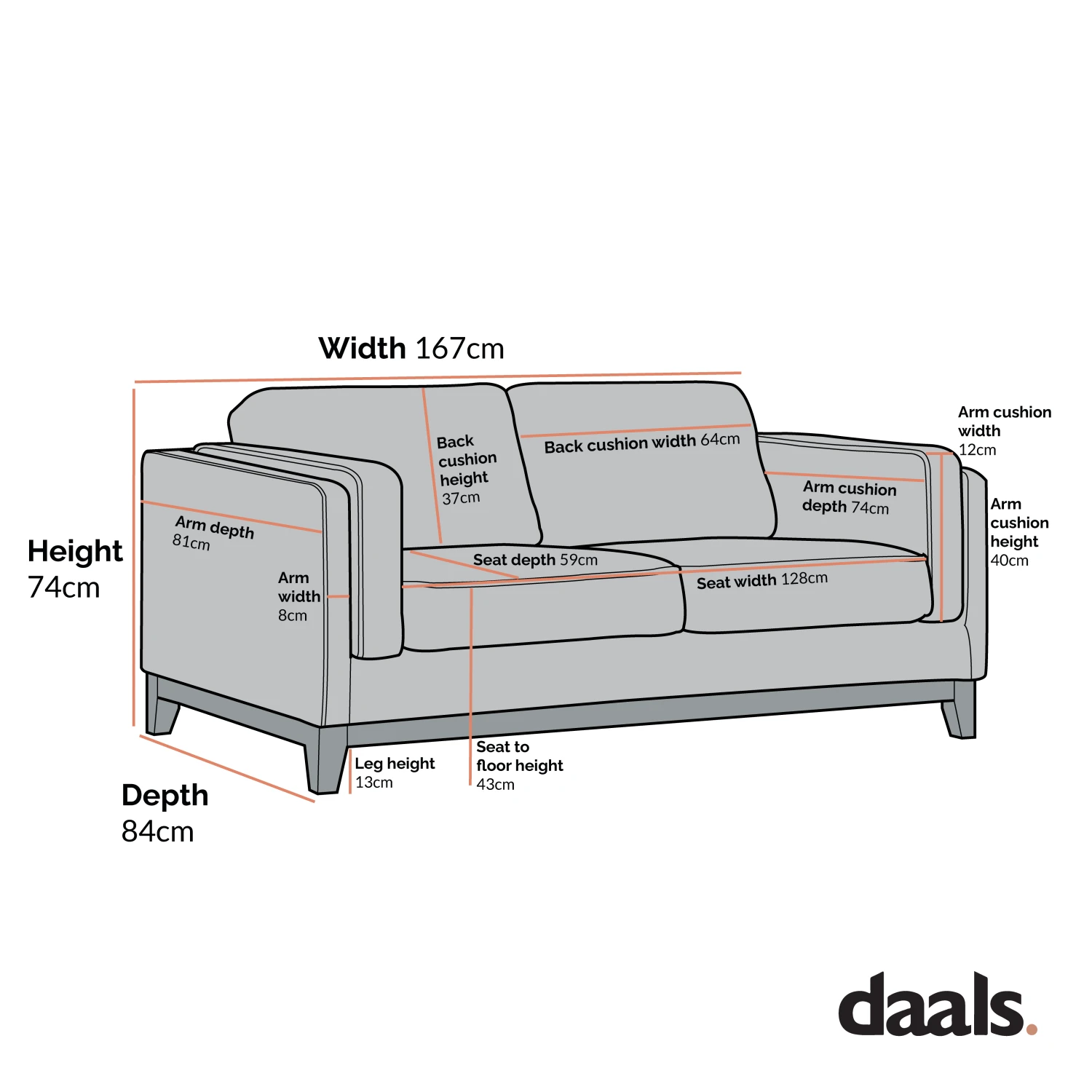 - Two seater sofa size: W 167 x D 84 x H 74 cm