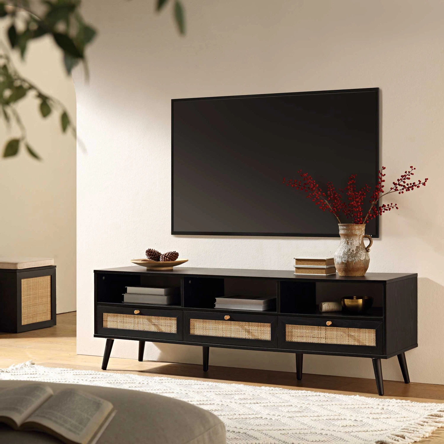 - Drawer door front: hand-woven natural rattan