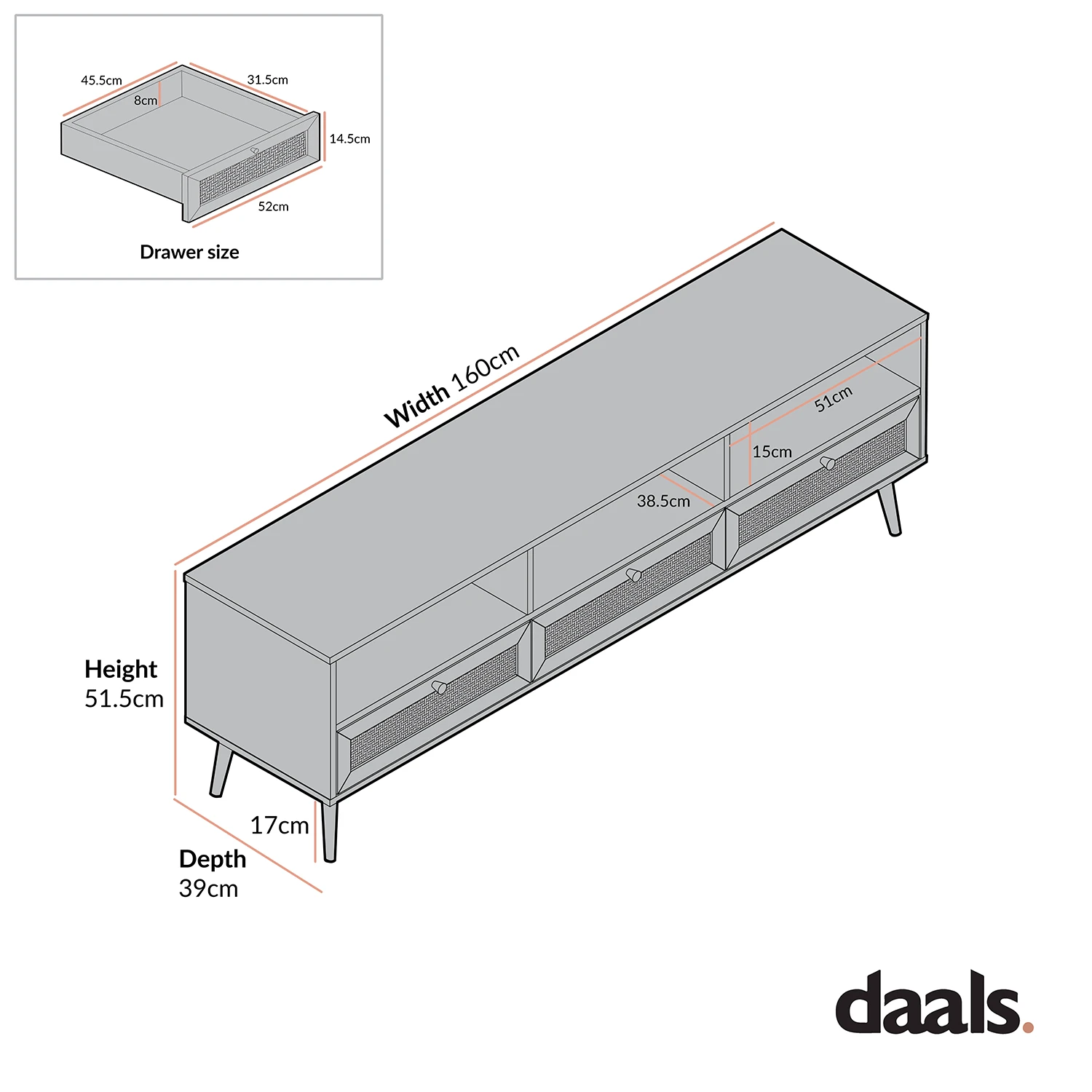 - Size: W 160 x D 39 x H 51.5 cm.
