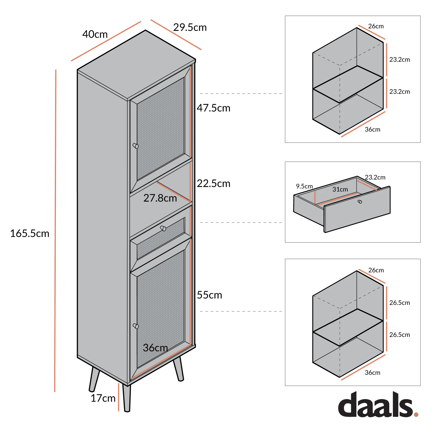 - Overall Dimensions: W 40 x D 29.5 x H 165.5 cm