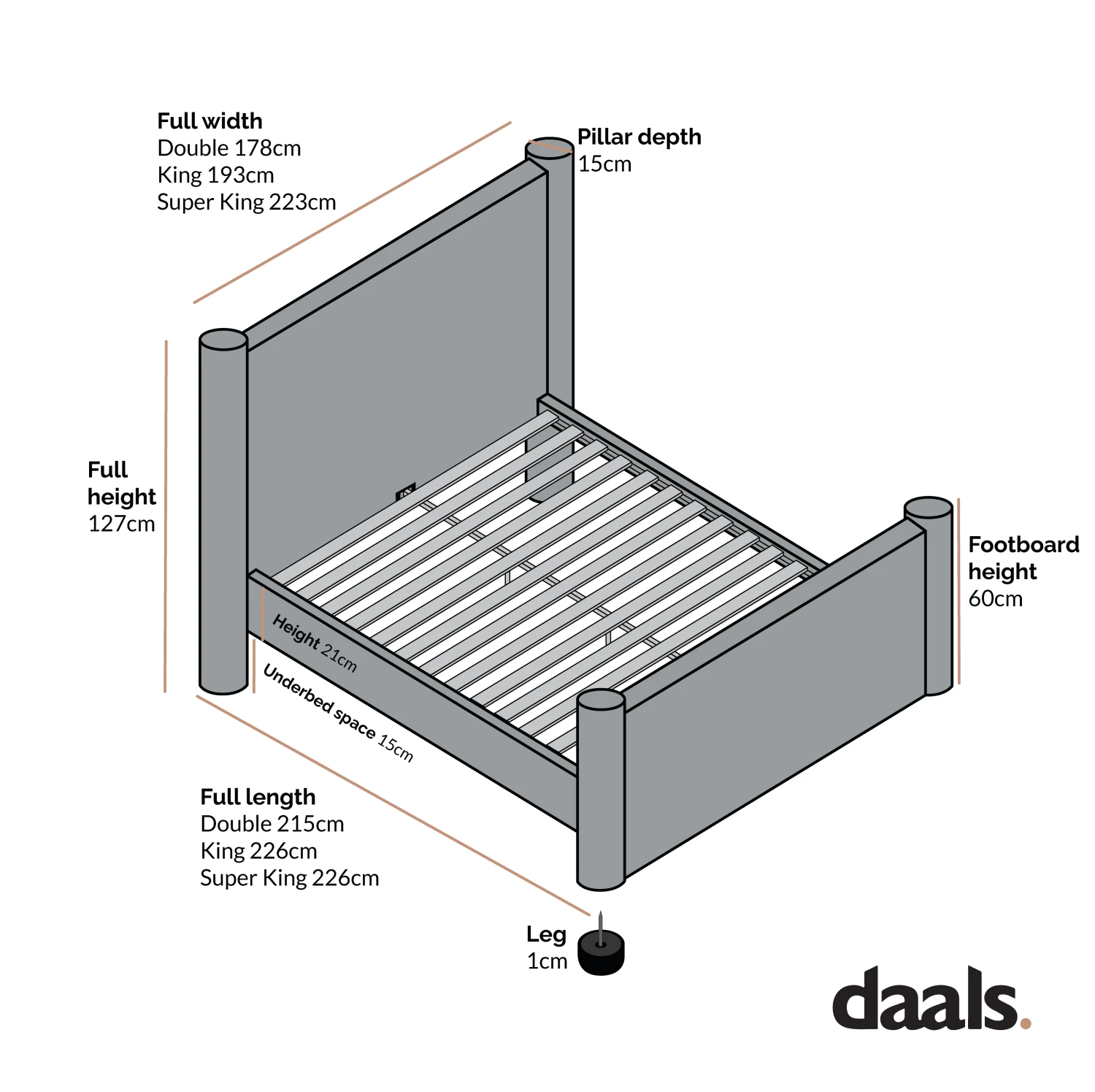 - 4FT6 Double: W 178 x D 215 x H 127 cm