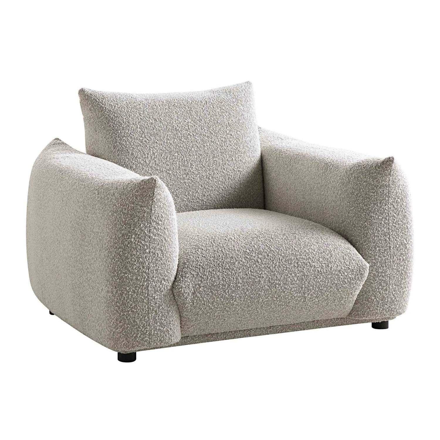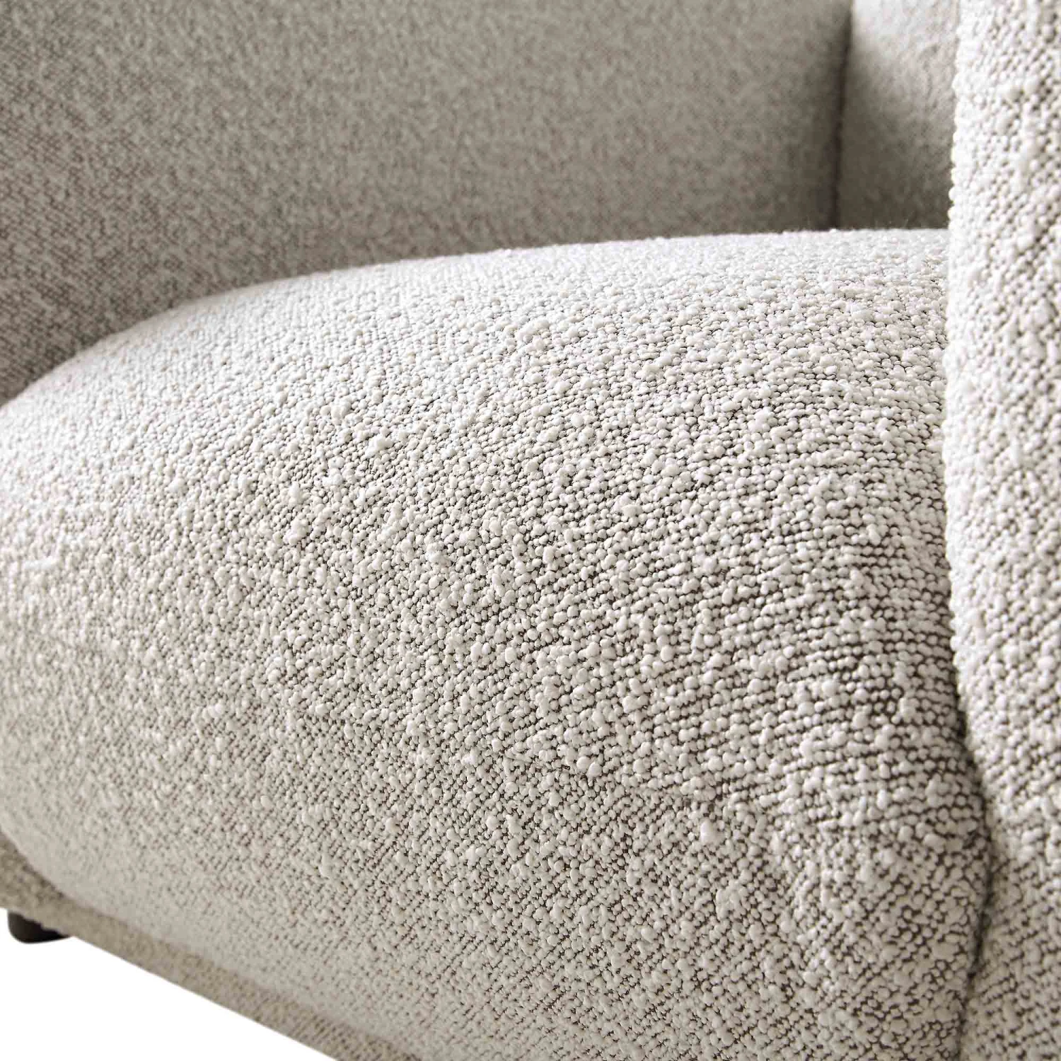 - Upholstered with chic mist grey boucle fabric for a contemporary look.