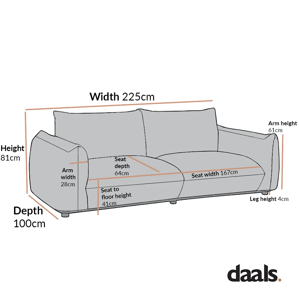 - Three seater sofa size: W 225 x D 101 x H 81 cm.