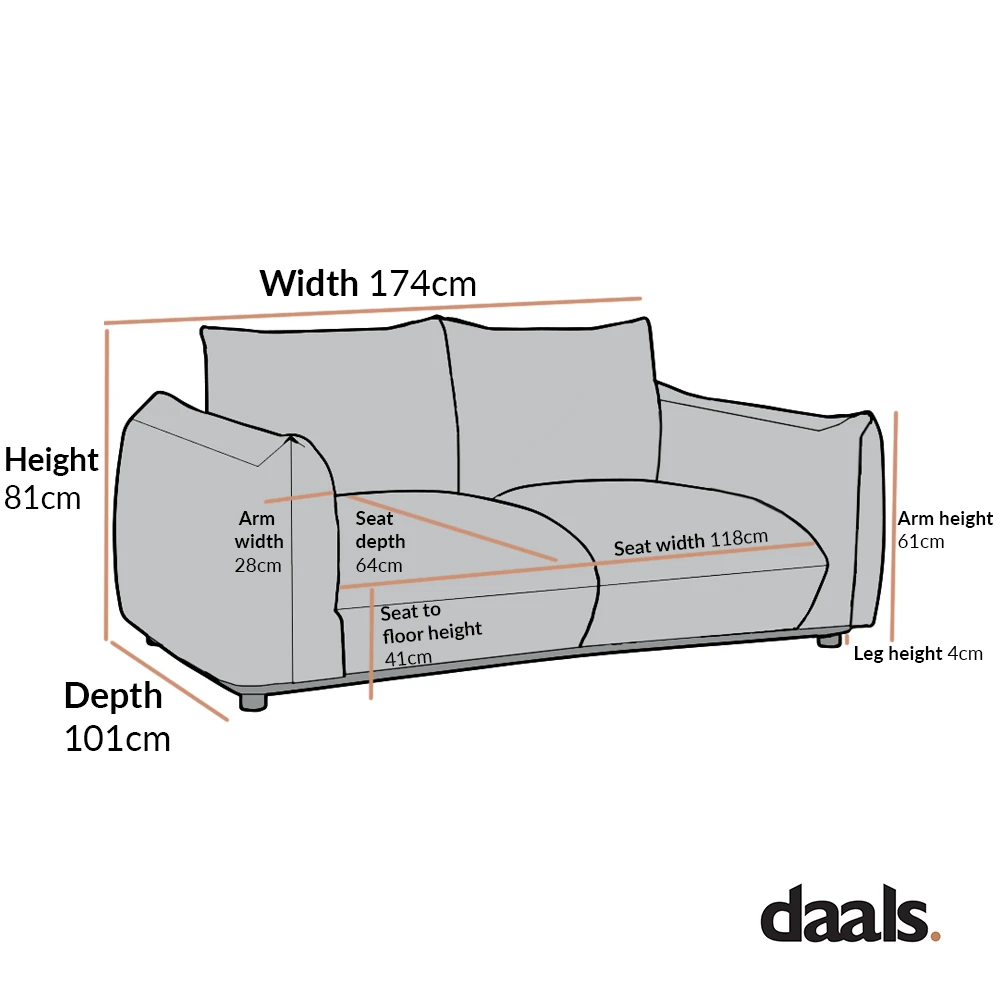 - Two seater sofa size: W 174 x D 101 x H 81 cm.