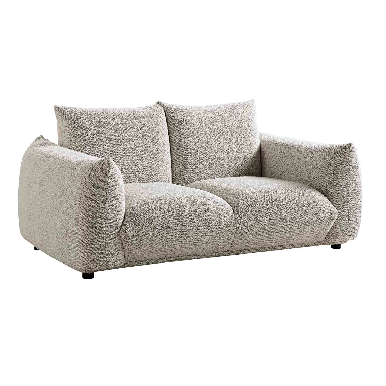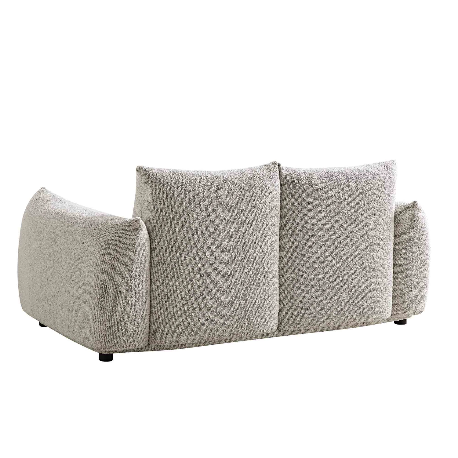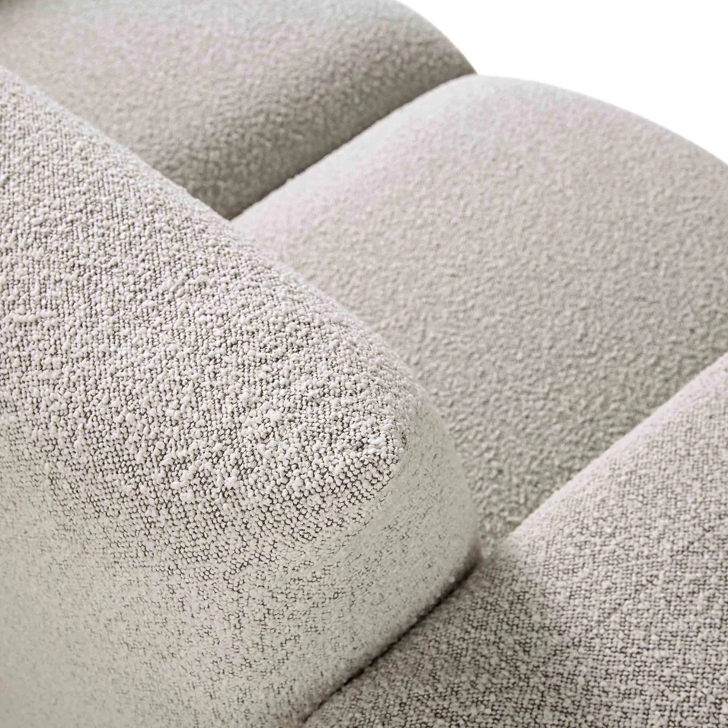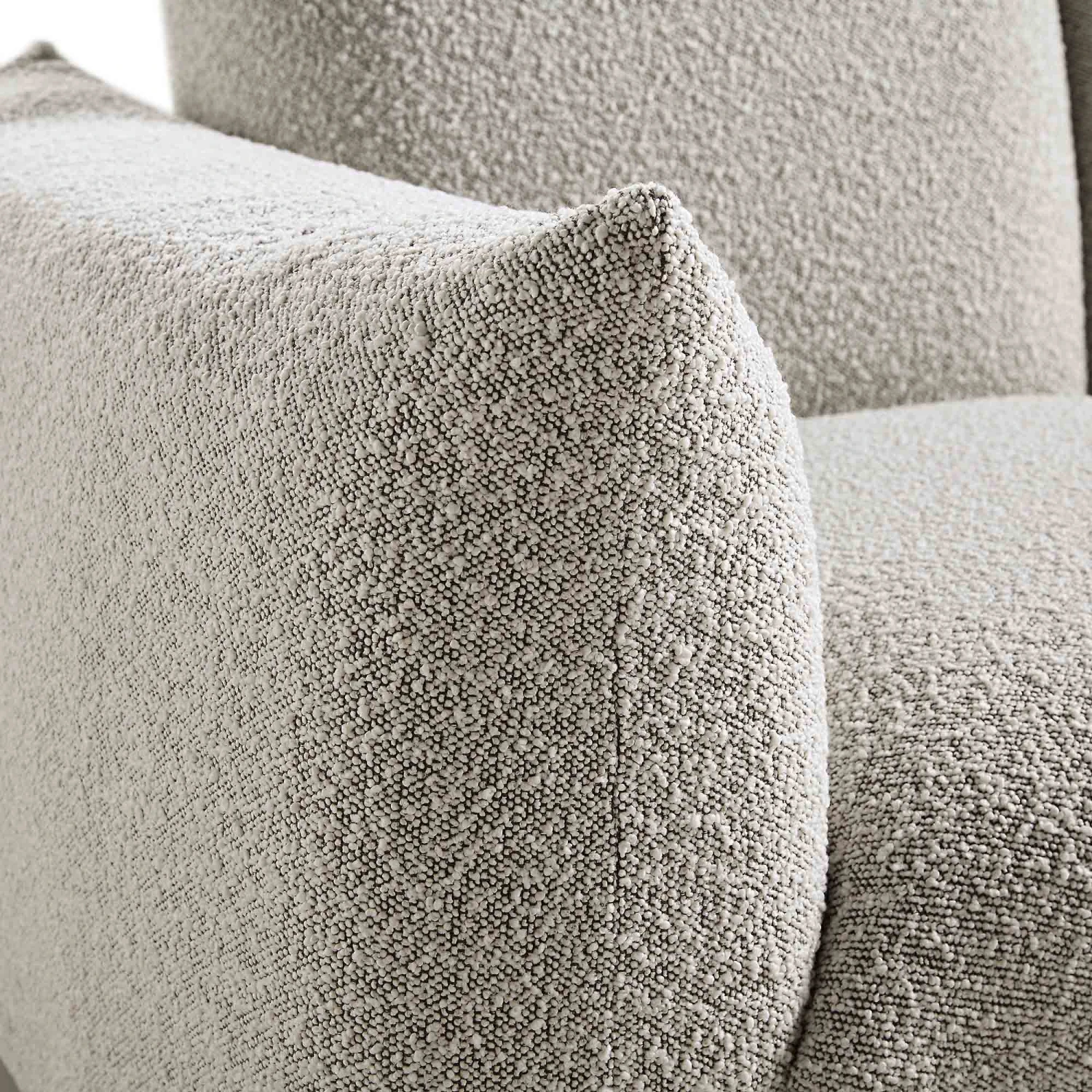 - Upholstered with chic mist grey boucle fabric for a contemporary look.