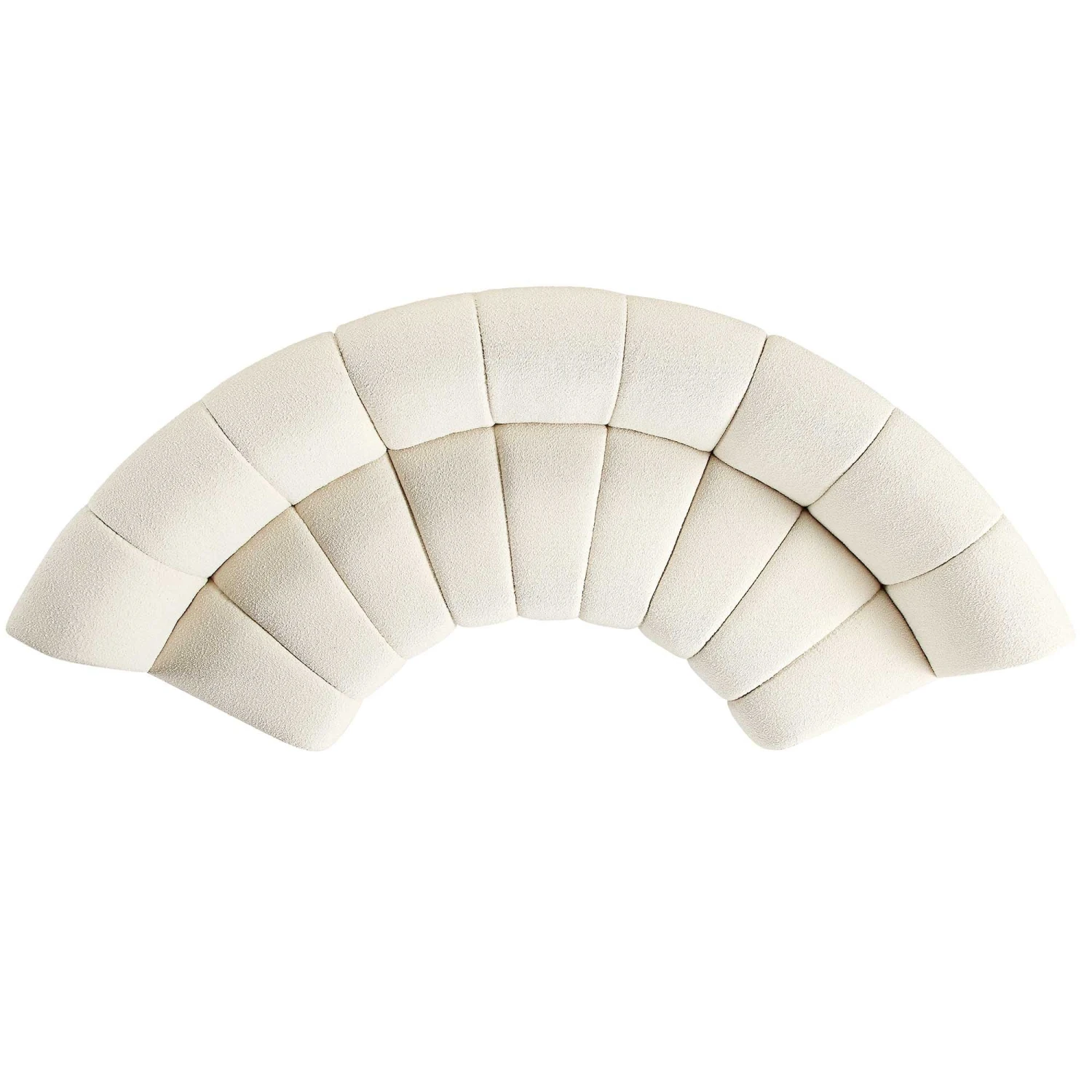 - Upholstered with beautiful ecru boucle fabric, the sofa modules are mounted on natural solid wood bases.