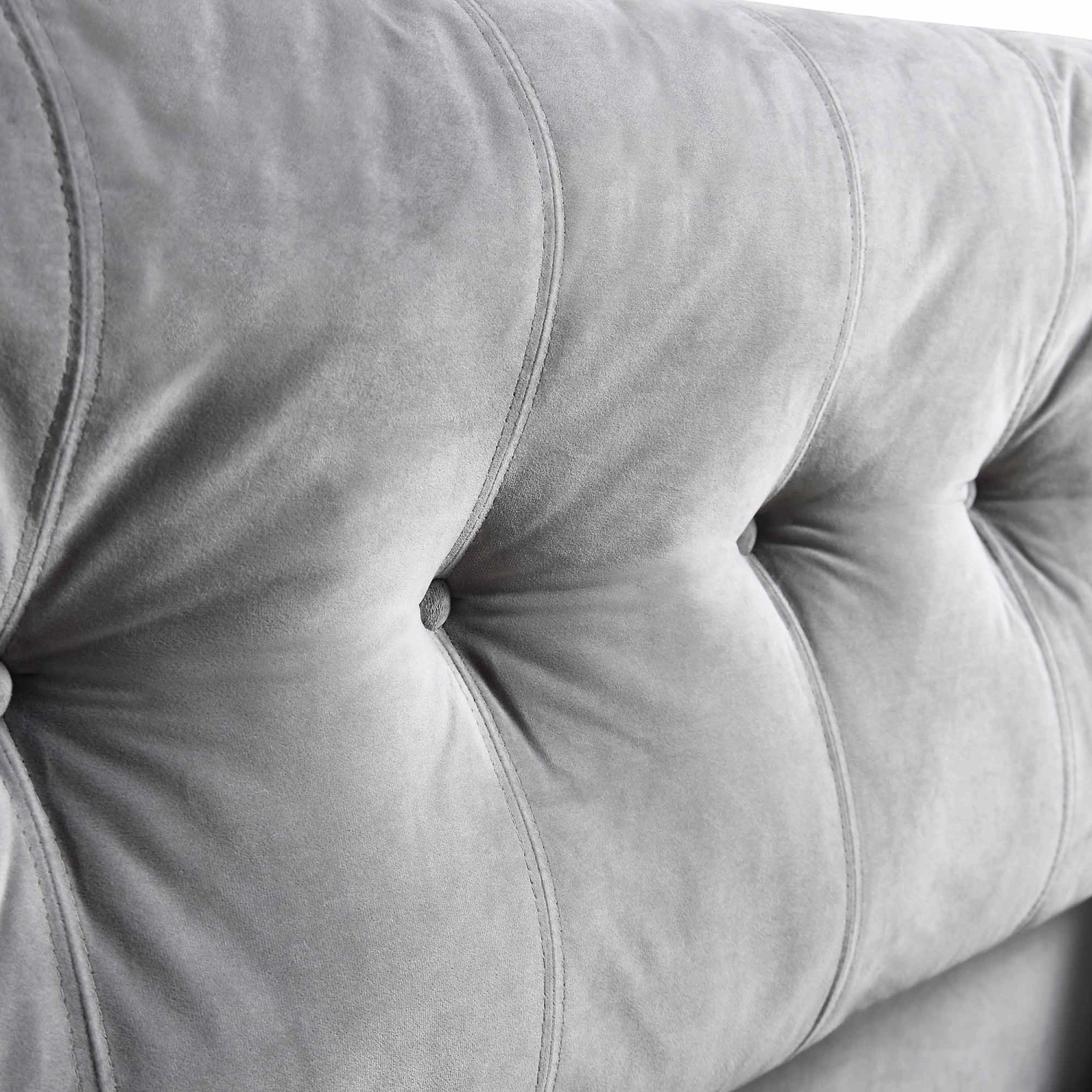 - Upholstered with soft velvet touch fabric in light grey colour (that can never go wrong), the bed sits chrome corner feet for a modern glam look.