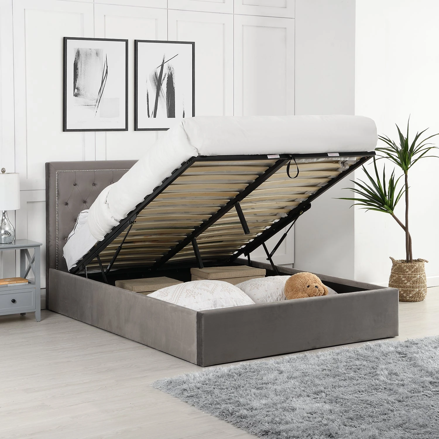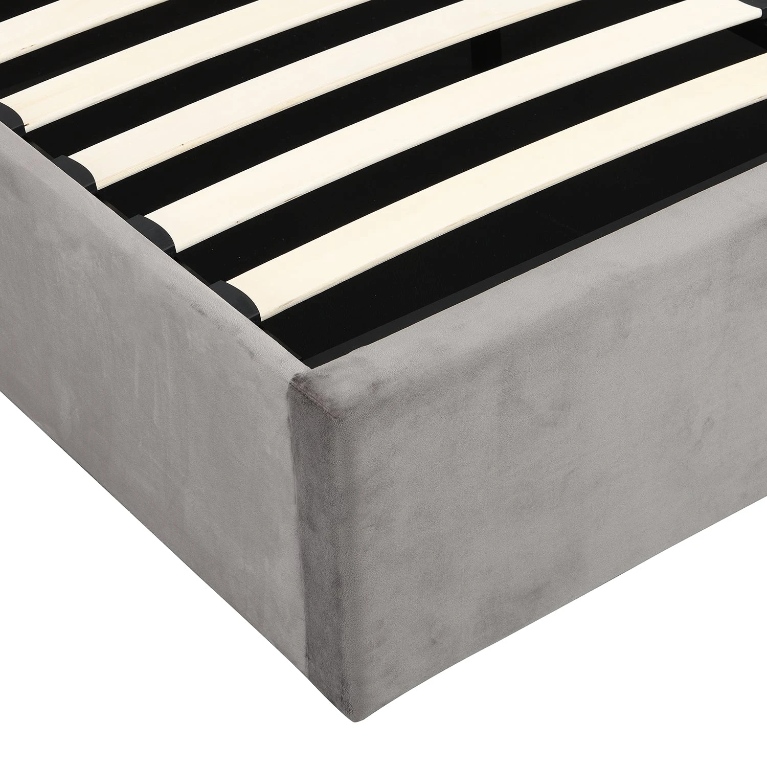 - The bed frame is fully upholstered with quality comfortable velvet touch fabric, with easy-to-access, gas-lift supported underbed storage opening from foot end.