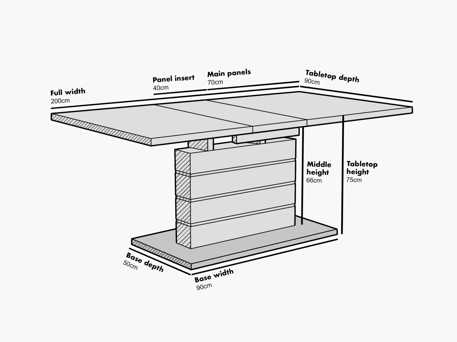 - Size: L 160 – 200 x D 90 x H 75 cm. Table weight: 65 kg. Table top thickness: 36 mm