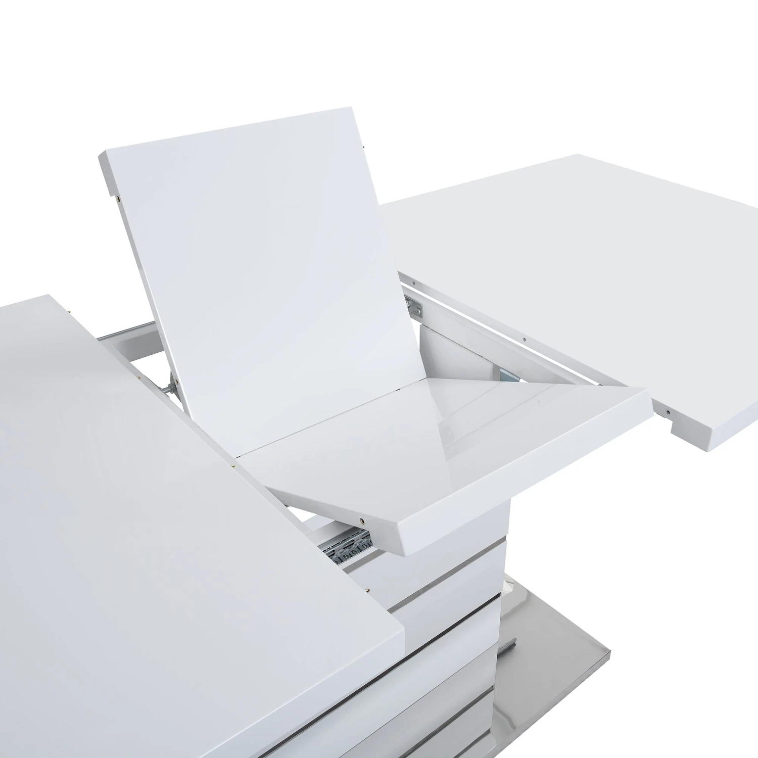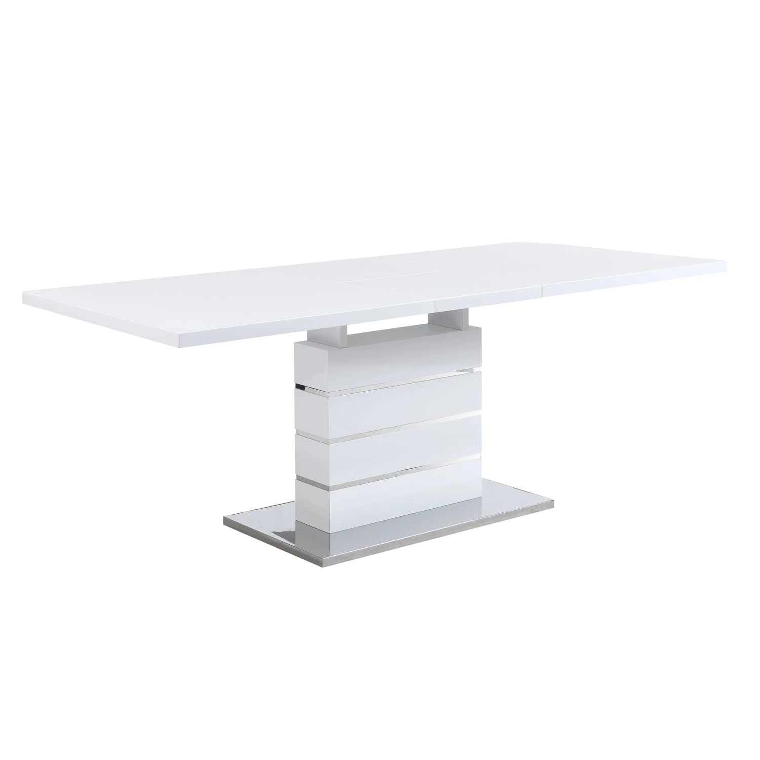 - The Hayne table is a beautiful and bold extending dining table that combines design and functionality for a modern dining setting. Boasting white high glossed finish and shining stainless steel base, this table easily extends to sit up to 8 people for family dining or friends parties.
