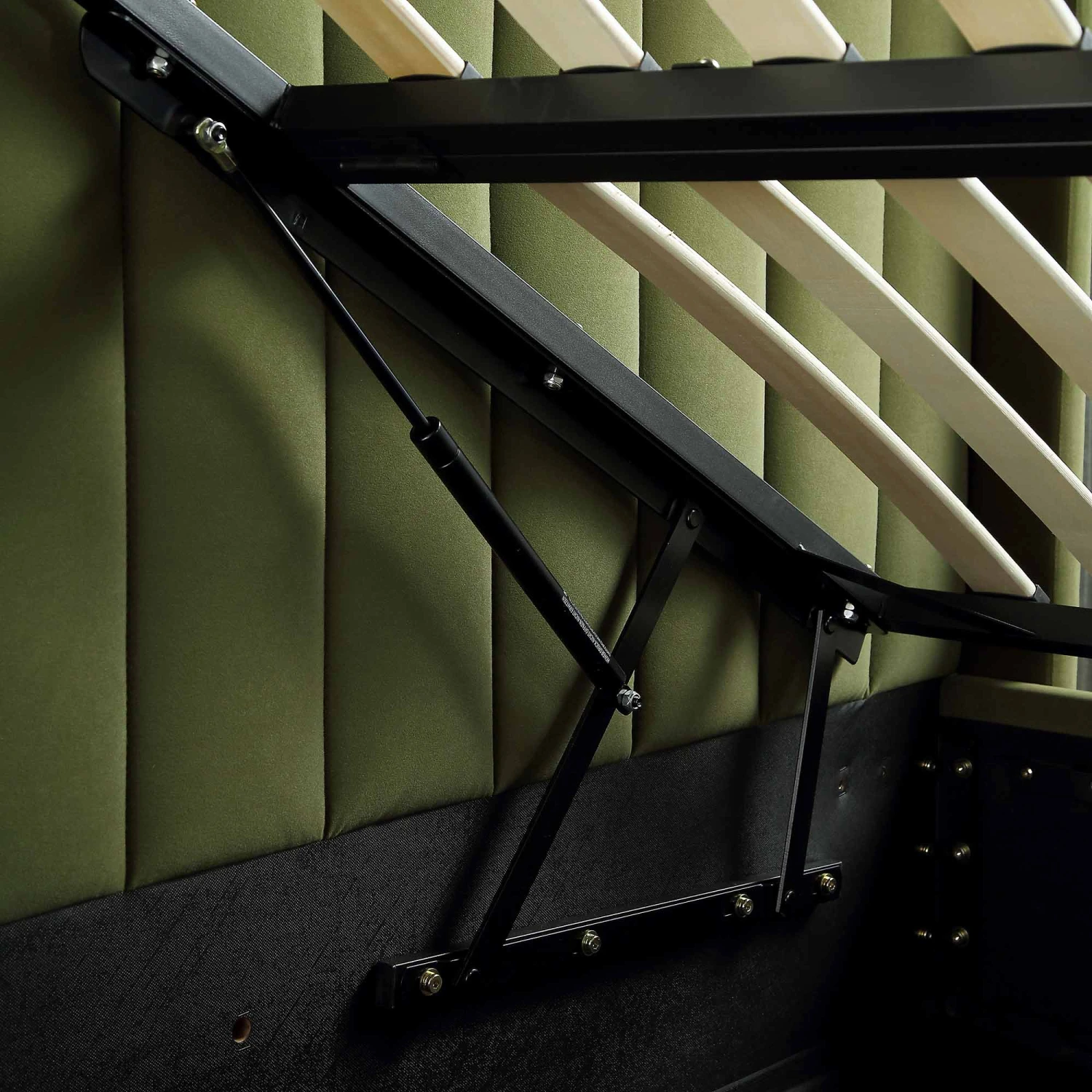 - The padded headboard with vertical tufting complements the sumptuous moss green velvet touch upholstery.